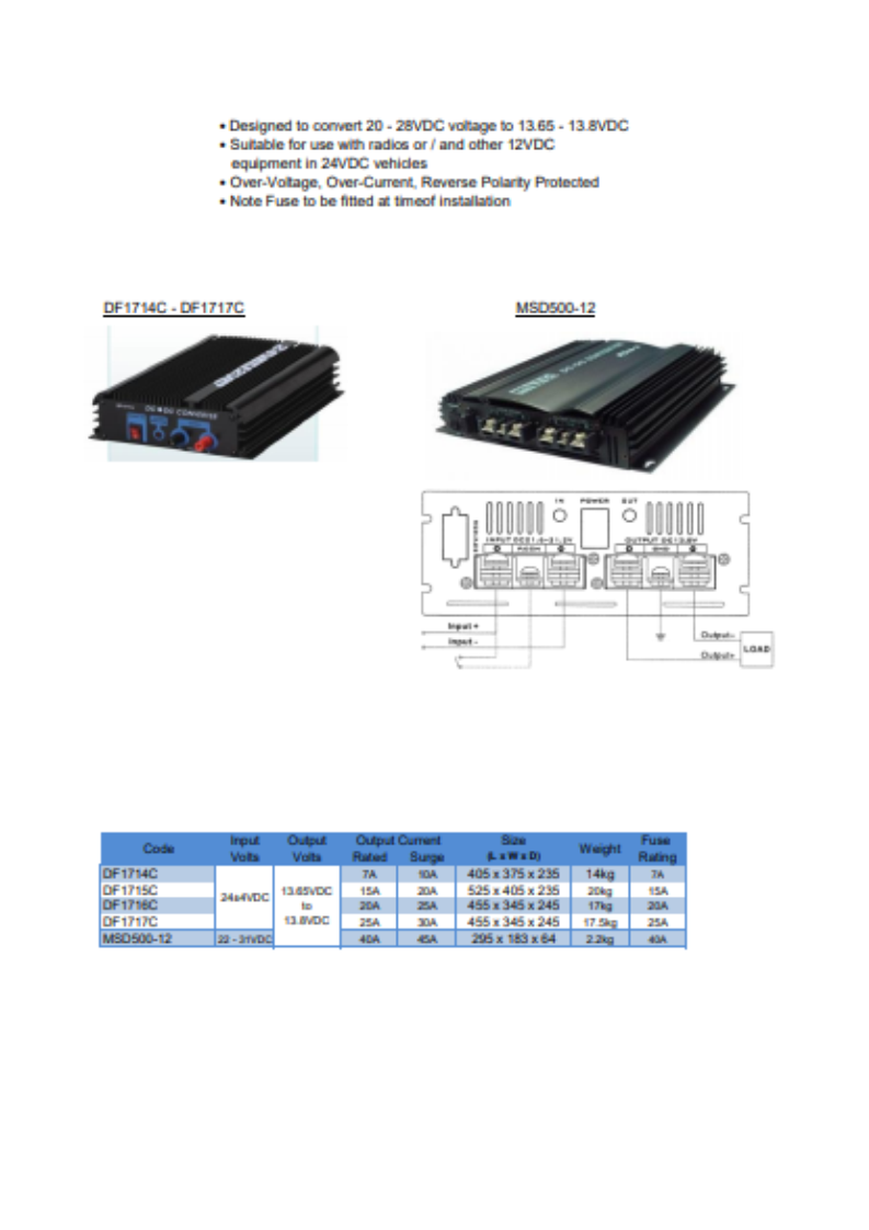 This series is designed to convert 20-28VDC voltage to 13.8VDC. Suitable for use with radios & other 12VDC equipment in 24VDC vehicles.